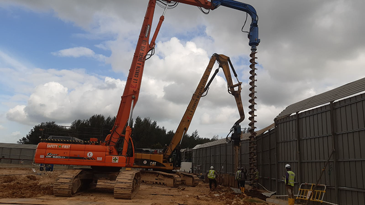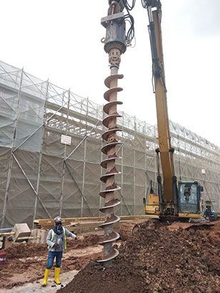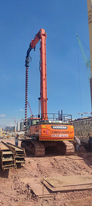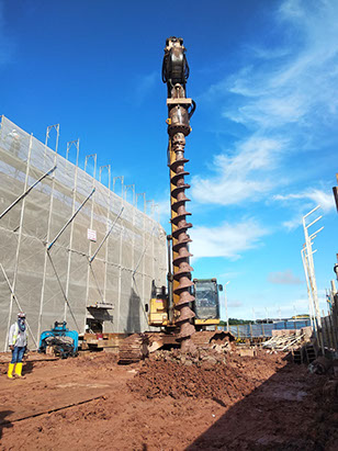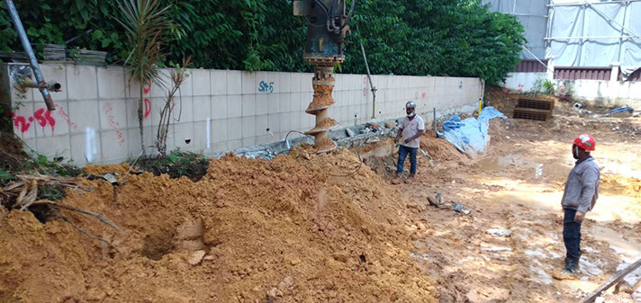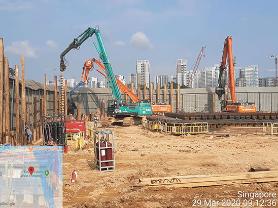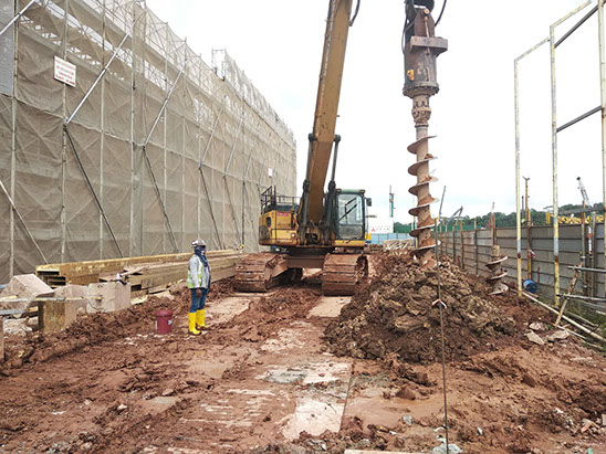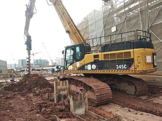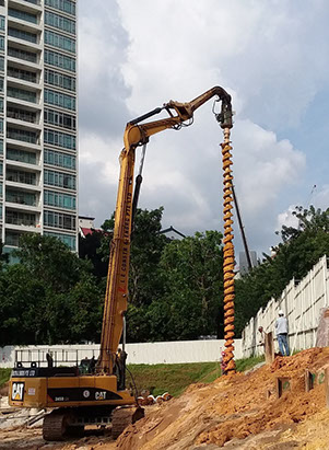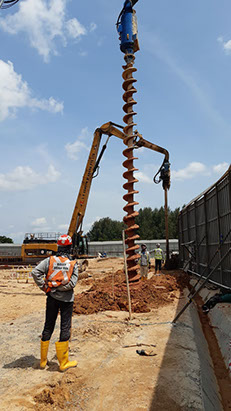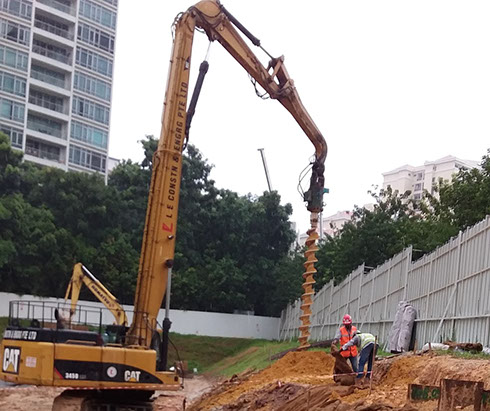 Excavator mounted auger bit machine can auger maximum 400mm diameter and18.0m length for install sheet pile, soldier and steel plate on soil condition Old Alluvium , Jurong Formation, Bukit Timah Granite (GV) . No vibration and Maximum noise level 10DBA